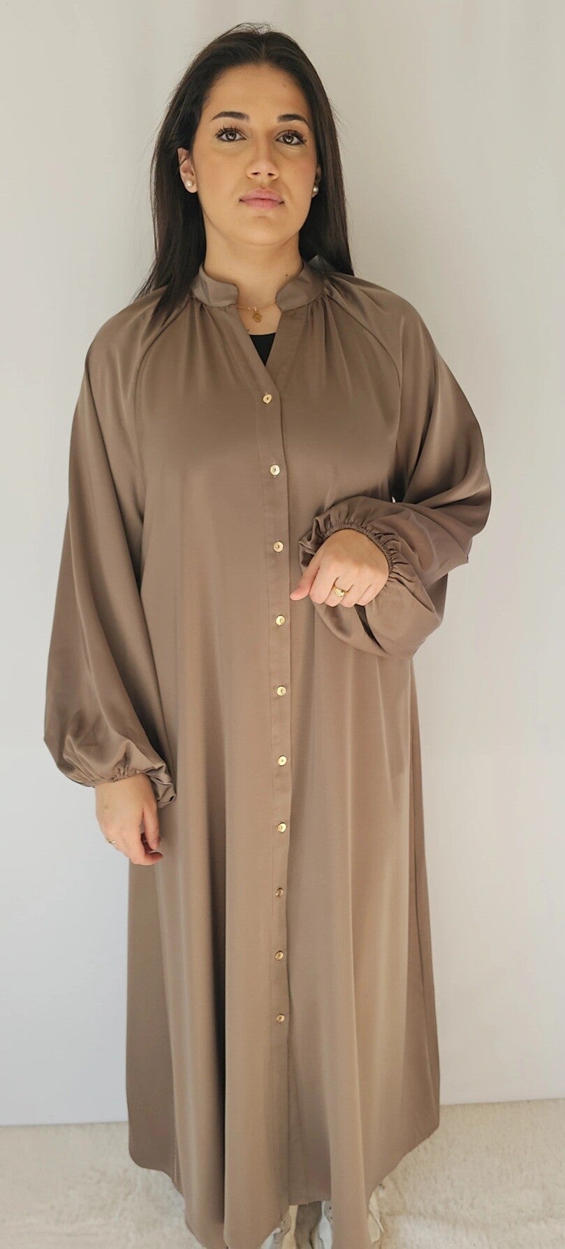 La robe Ambre est une robe chemise en satin avec des manches élastiques, bouffante et des boutons doré.